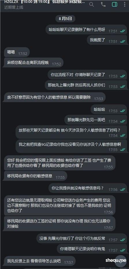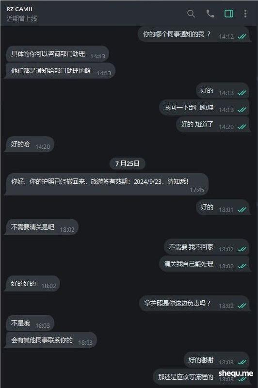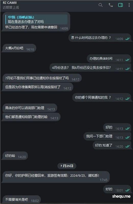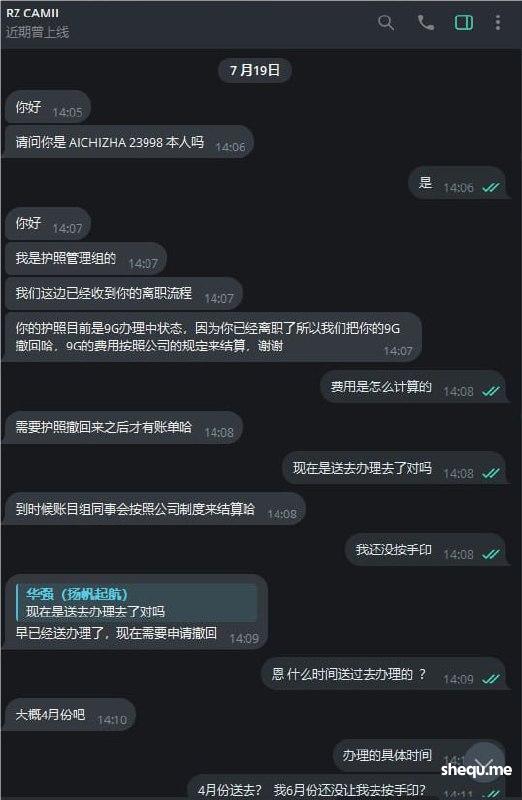 7月19日公司RZ部门 RZCAMII同事联系我说收到了离职申请,目前我的护照办理9G中离职了要把我的9G撤回  我问什么时间送过去办理回复我4月份, 说7月初同事通知我去按指纹 而我接到消息都7月11日了